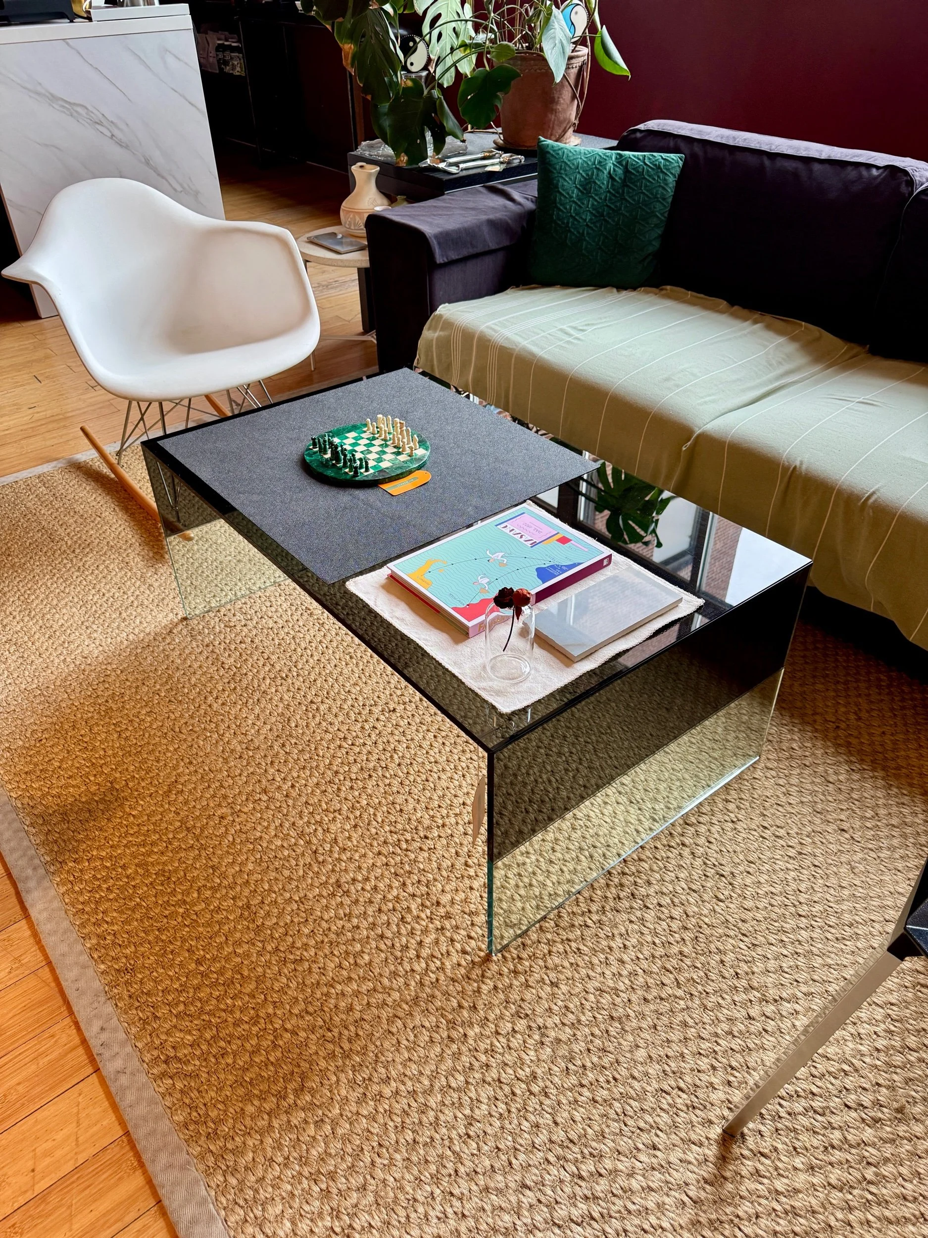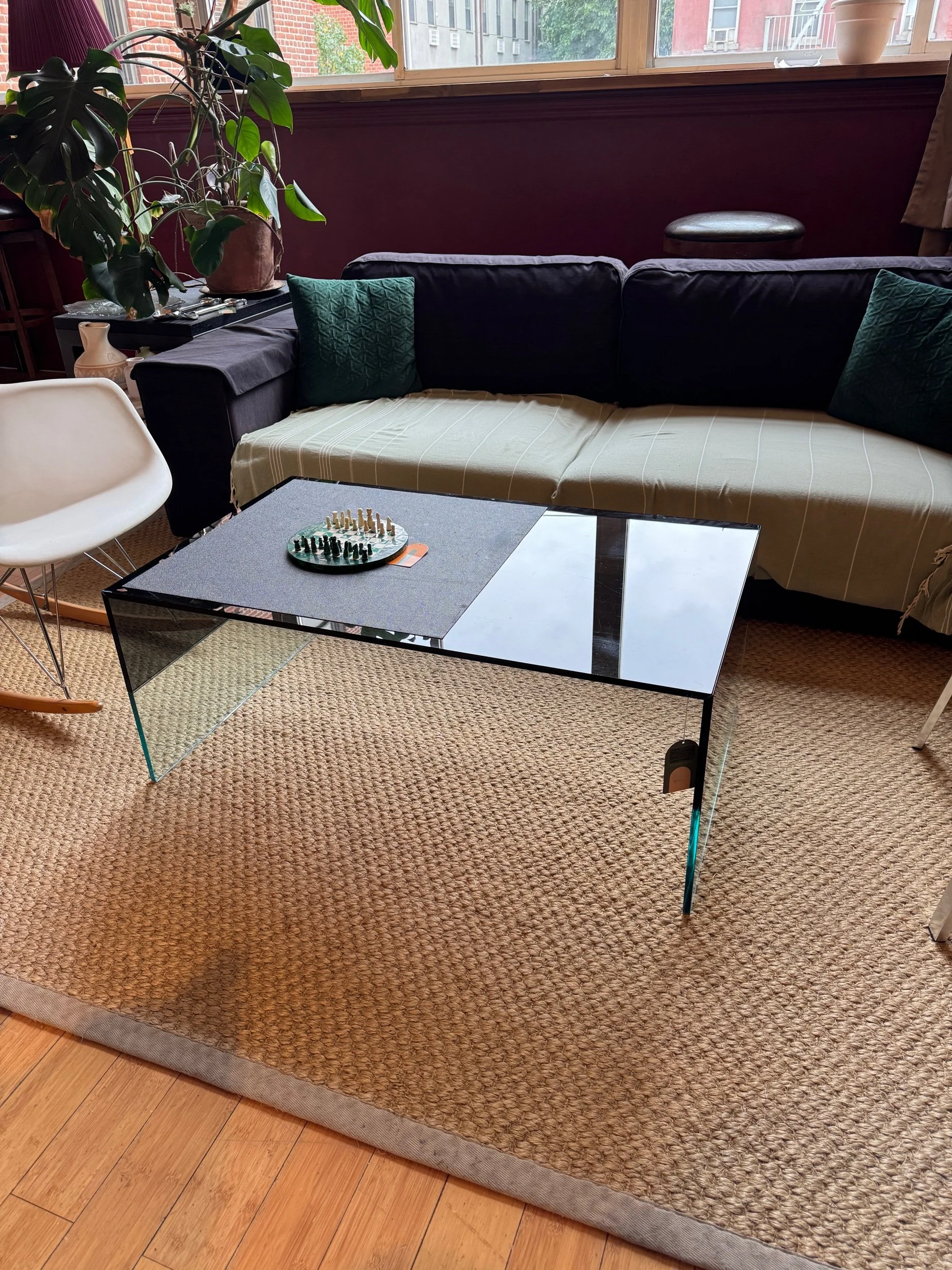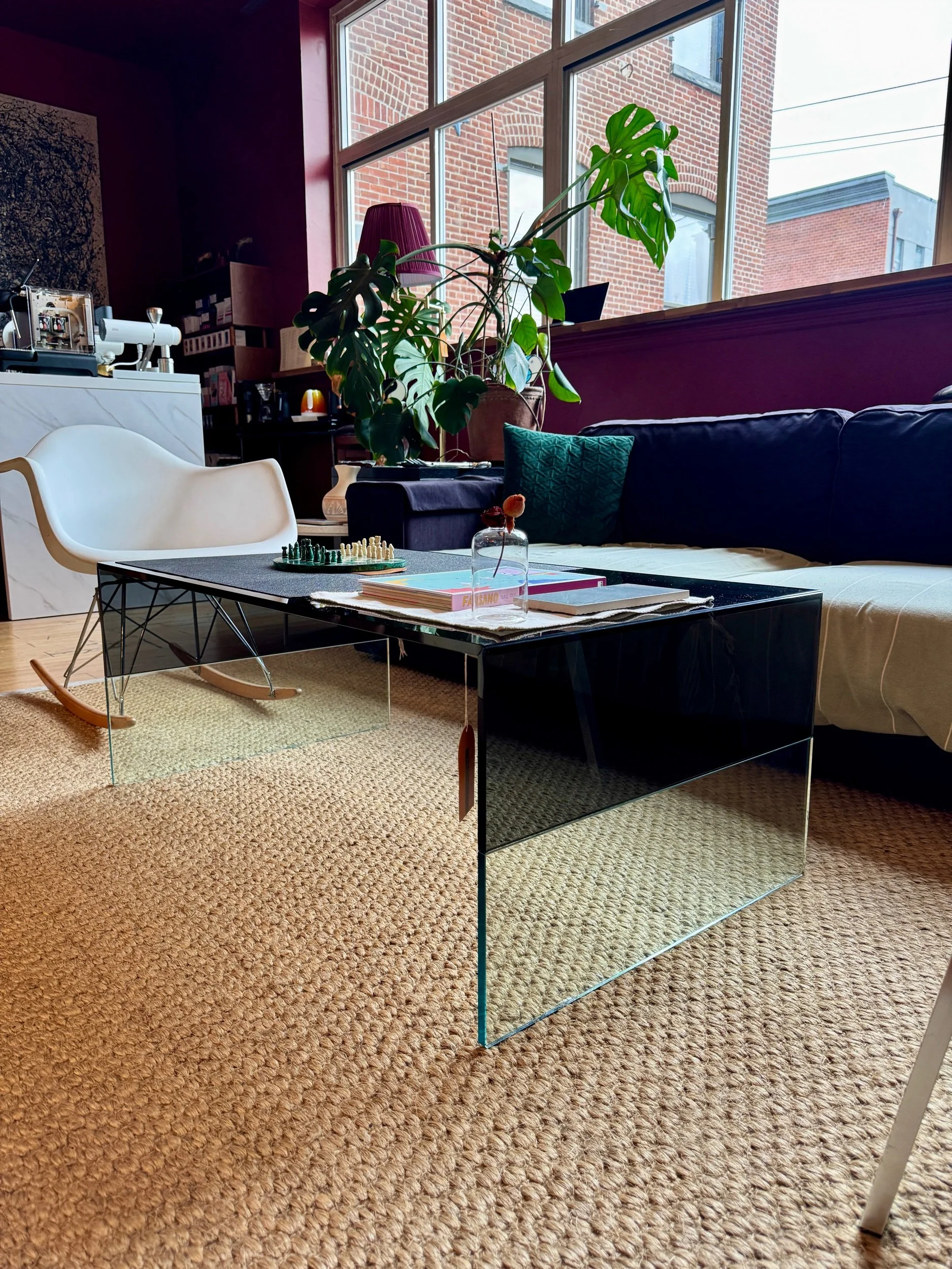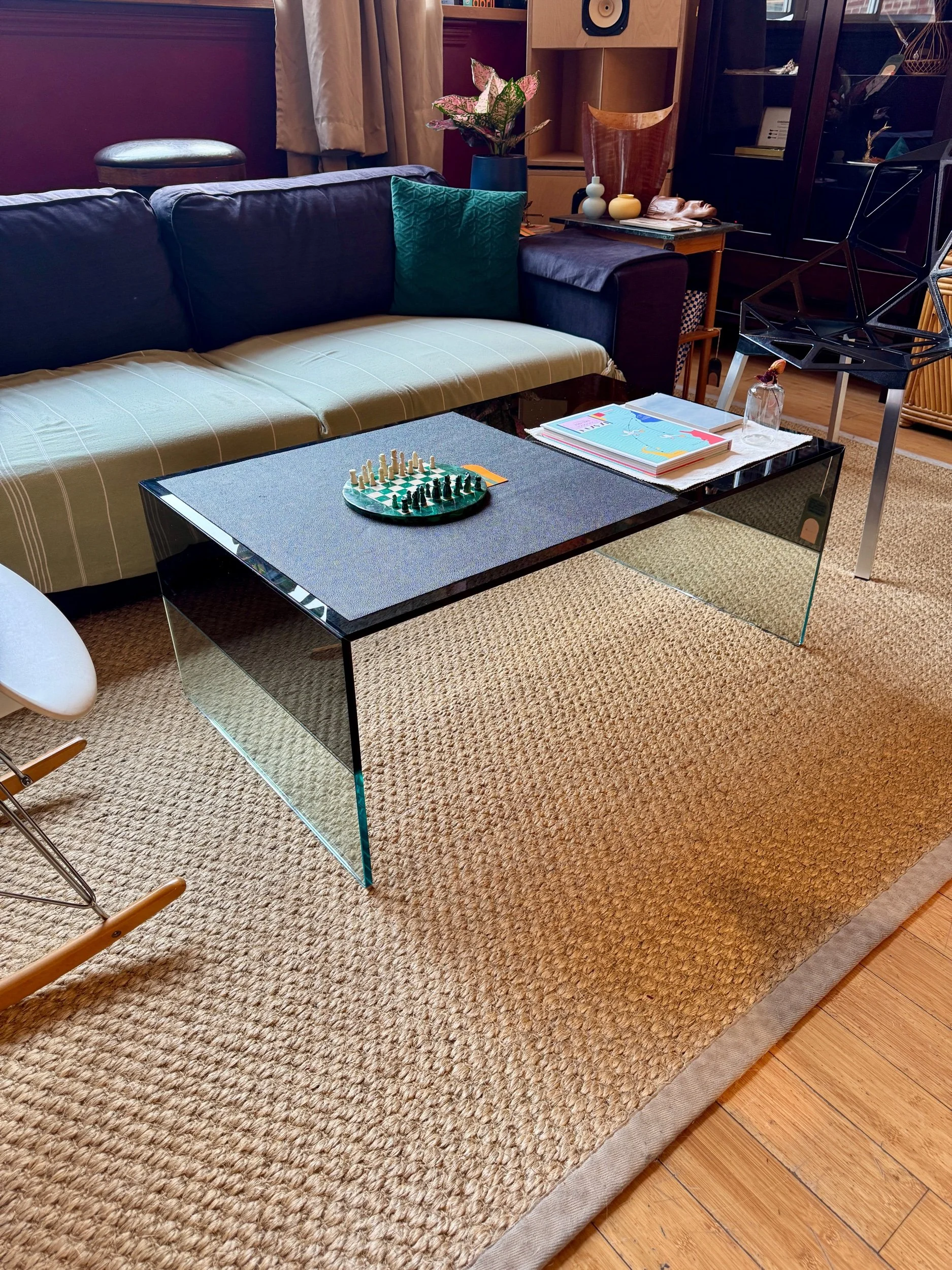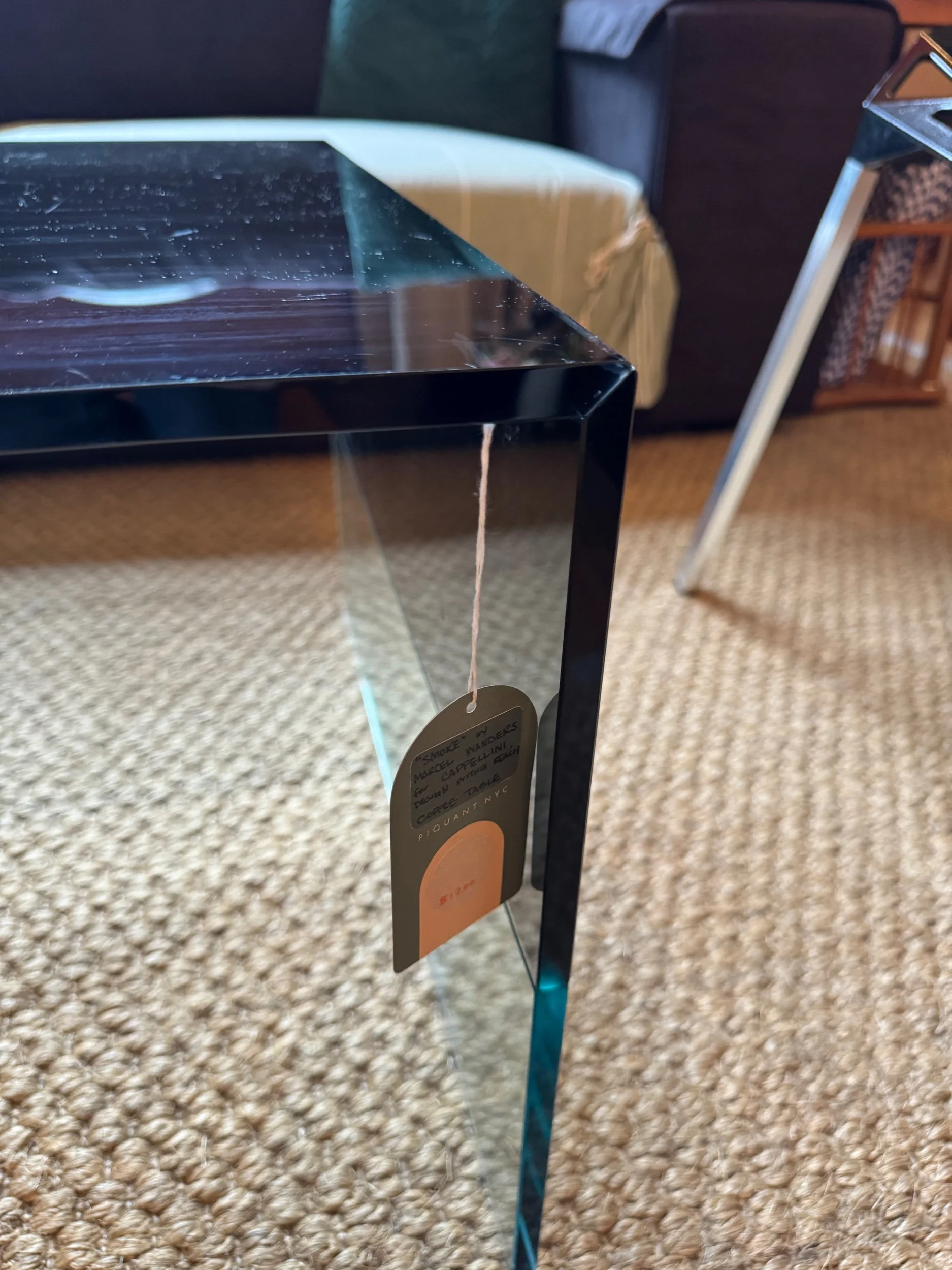 The Smoke table is characterized by the mitring of transparent and blue or smoky grey coloured glass on both sides; the coloured glass also continues across the table top.